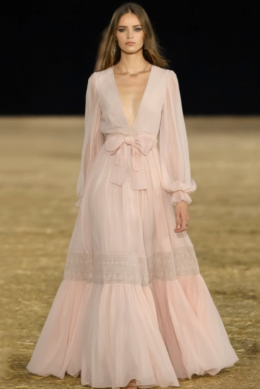 Este impresionante vestido maxi de escote en V profundo presenta delicados detalles de encaje y un elegante lazo, exudando feminidad atemporal. La silueta fluida se drapea con gracia sobre el cuerpo, mientras que el suave tono rosa agrega un toque romántico. Perfecto para eventos formales, galas o soirées de lujo, este vestido combina sofisticación con un toque de atrevida seducción. El cuerpo ajustado y el diseño de largo hasta el suelo aseguran un look glamuroso, digno de la alfombra roja. Un imprescindible para quienes aman la elegancia con un toque audaz.