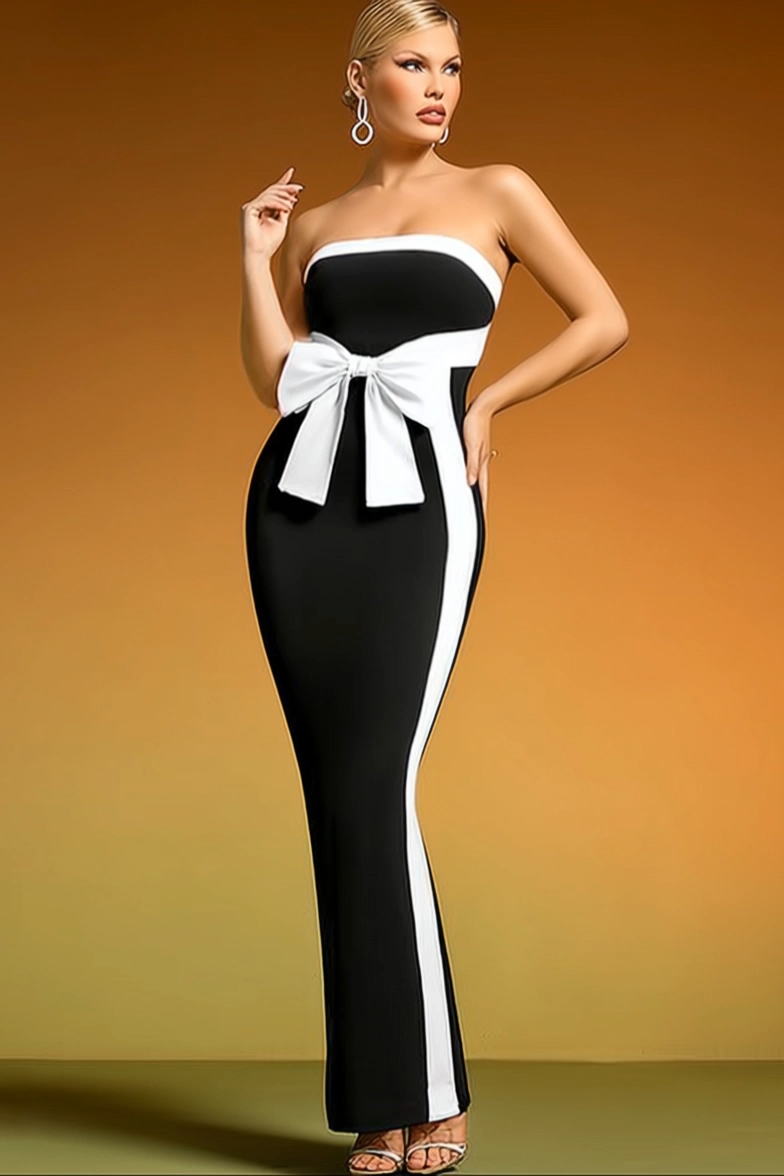 Formal Evening Dress Black White Strapless Bow Maxi Dress